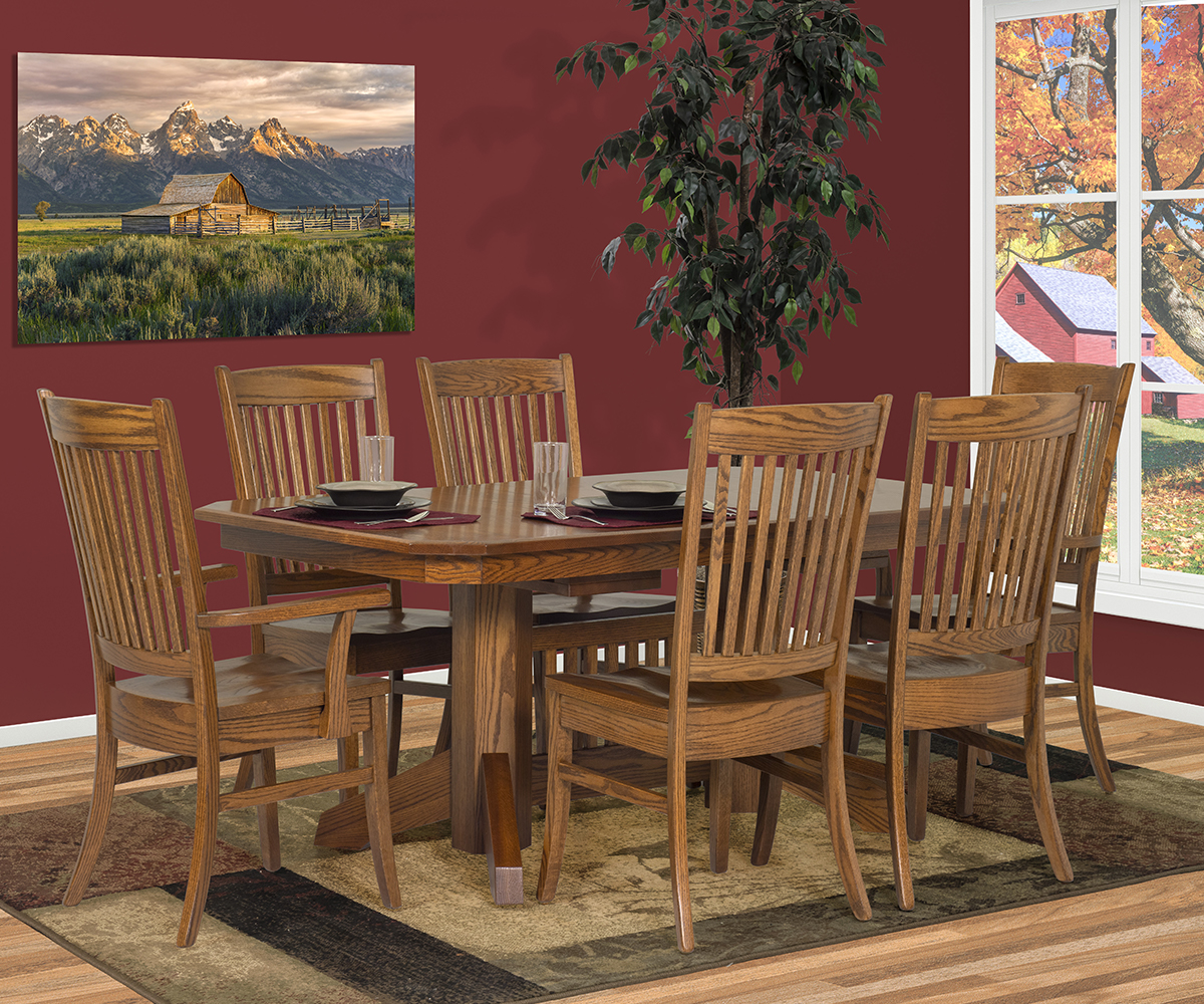 Table shown 42 x 66″ in oak with OCS-110 medium stain. Clip corner top with 1⁄2″ beveled edge. Shown with Mission base with four M6 feet. Franklin chairs.